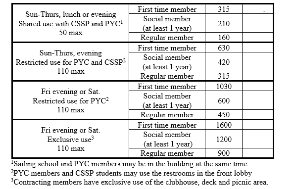 When a member reserves the facility for exclusive use, members are asked not to use the grounds or the facility during the private event. Exclusive usage must be approved by the board in advance. The private party events will be listed on the PYC Calendar. Member must clean up the area, empty the trash and lock the Clubhouse.
